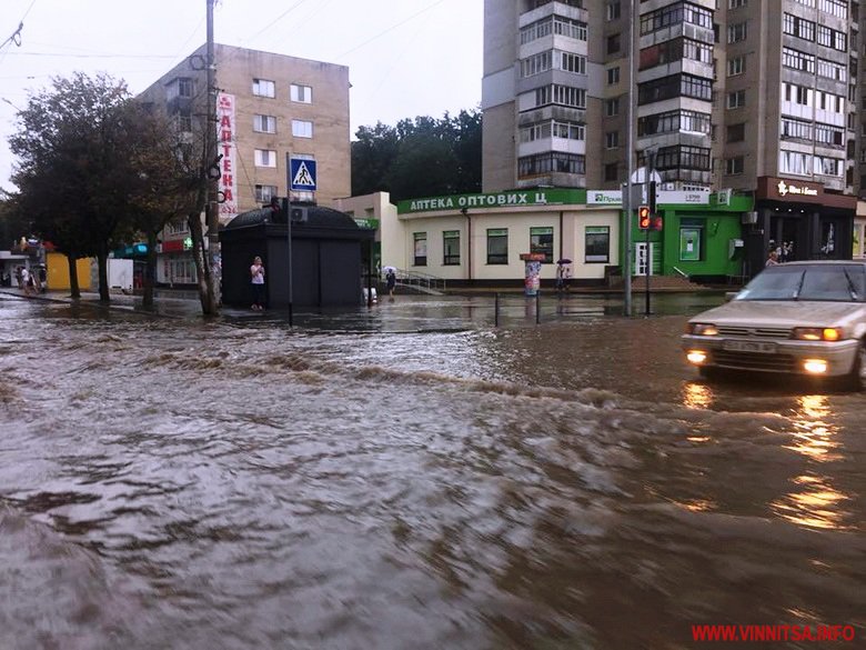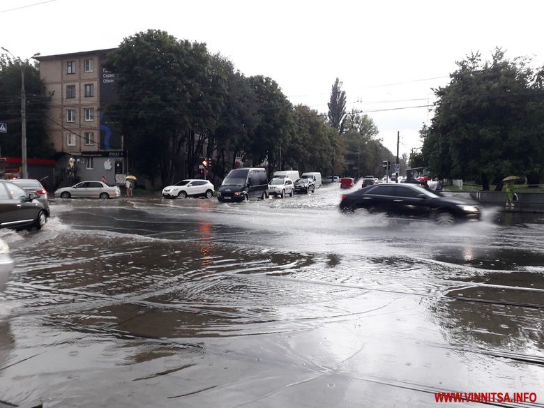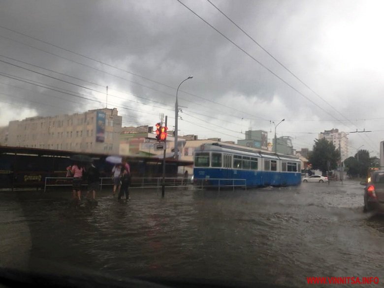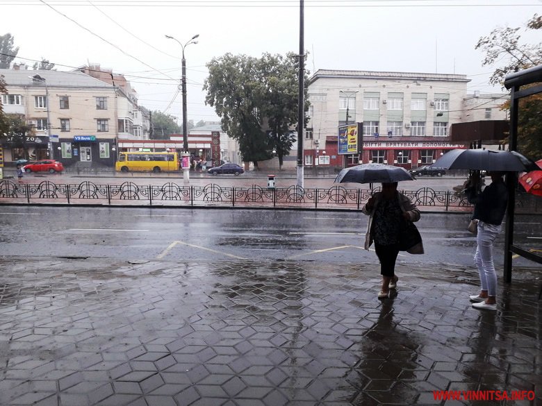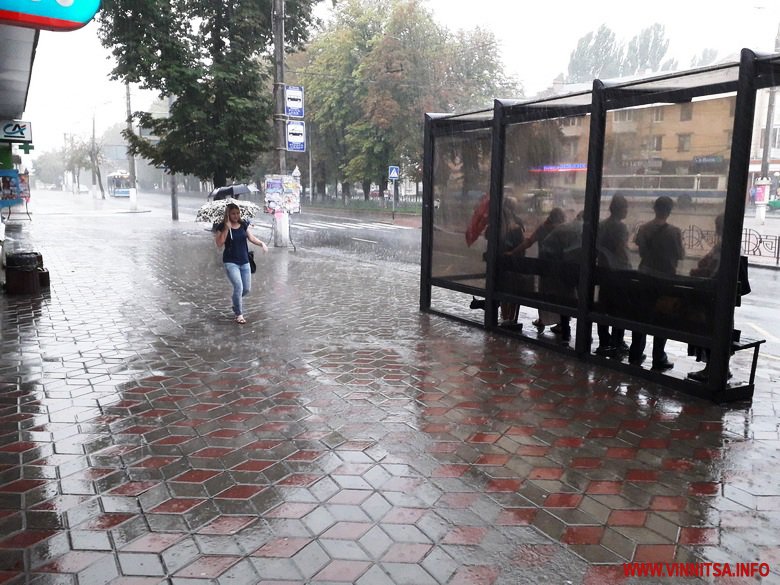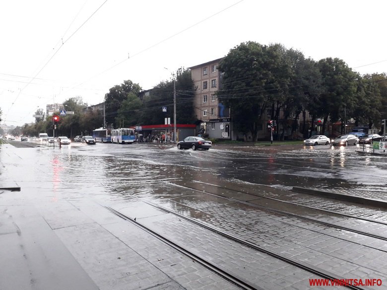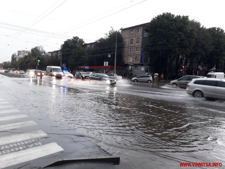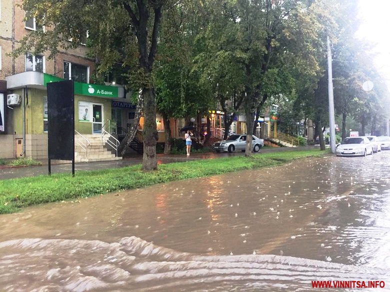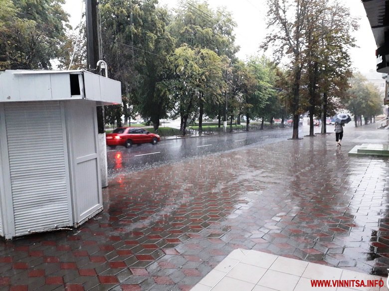 28 липня, по обіді, у Вінниці розпочалася сильна гроза – з громом і блискавкою. Дощ не перестає йти вже кілька годин. Зливові каналізації не справляються з потоком води на всіх вулицях.