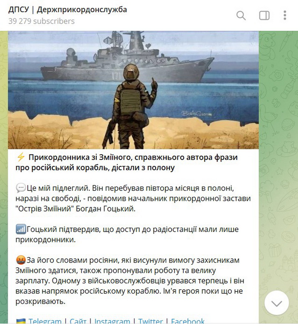 Тим часом поки легендарний вислів з острова Зміїний увіковічили у малюнках та на марках, у Державній прикордонній службі заявили, що напрямок російському кораблю завдав не той захисник. За їх повідомленням, справжнього автора фрази про російський корабль, дістали з полону.