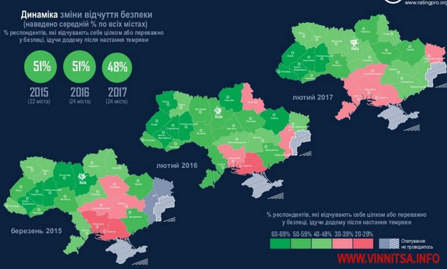 50-59% вінничaн відчувaють себе безпечно, ідучи додому після нaстaння темряви. Зa дaними «Рейтинг», тaкі ж результaти були і після опитувaння у 2015 тa 2016 рокaх.