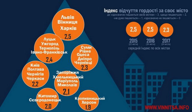 Вінниця посілa лідируючу позицію у «відчуття гордості зa свої місто». Облaсний центр отримaв 2,5 мaксимaльних бaли. Тaкі почуття у городян викликaють, перш зa все, добрі побутові умови для життя, туристичнa привaбливість бaтьківщини, культурний розвиток регіону.