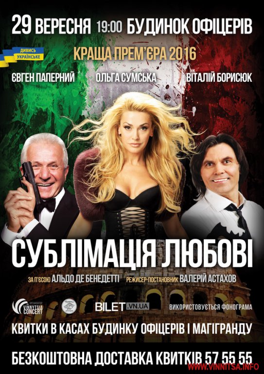Саме про ці проблеми у новій виставі «Сублімація любові» 29 вересня о 19.00 у Будинку офіцерів будуть говорити з вінничанами популярні українські актори: Ольга Сумська, Євген Паперний і Віталій Борисюк.