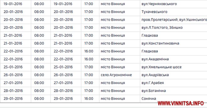 «Вінницяобленерго» оприлюднило графік планового відключення світла січень 2016-го року, згідно якого електроенергії в оселях городян не буде через технічне обслуговування, ремонт, розчистку траси та встановлення балансового обліку. Світло не вимикатимуть під час новорічних і різдвяних свят, а саме – з 1 по 10 січня.