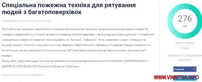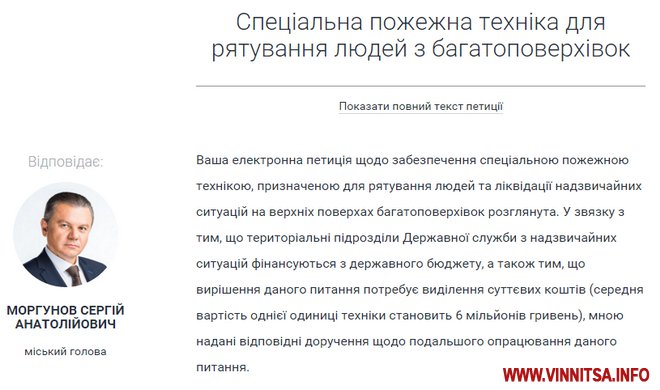 На сайті петицій до Вінницької мерії з’явилися офіційна відповідь Сергія Моргунова щодо електронного звернення про придбання спеціальної техніки для рятування людей з багатоповерхівок.