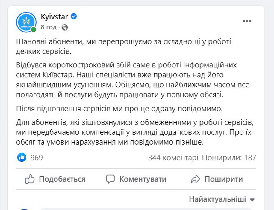 «Шановні абоненти, ми перепрошуємо за складнощі у роботі деяких сервісів. Відбувся короткостроковий збій саме в роботі інформаційних систем Київстар. Наші спеціалісти вже працюють над його якнайшвидшим усуненням. Обіцяємо, що найближчим часом все полагодять й послуги будуть працювати у повному обсязі.