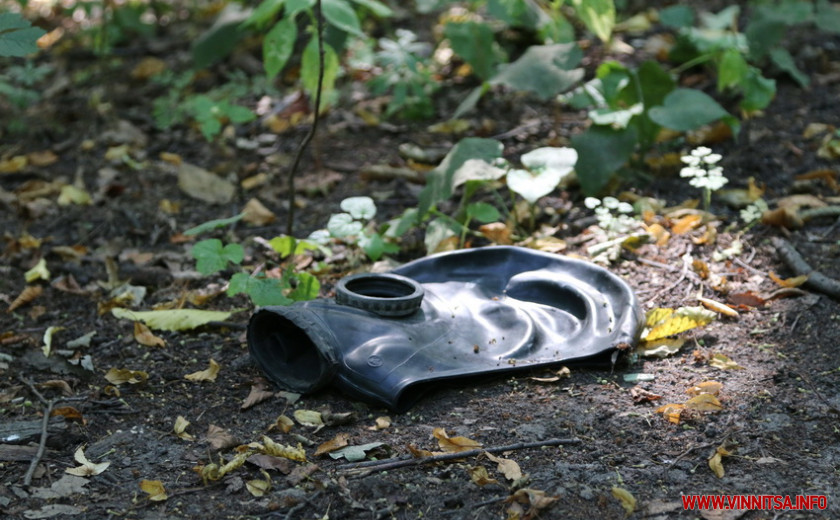 Видно, що територія комплексу відома місцевим, оскільки і тут навколо є купи сміття, в основному – пляшки. Хтось залишив неподалік підземного комплексу протигаз. Точніше, його частину. І судячи зі стану матеріалу, лежить він тут не дуже давно.