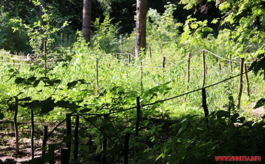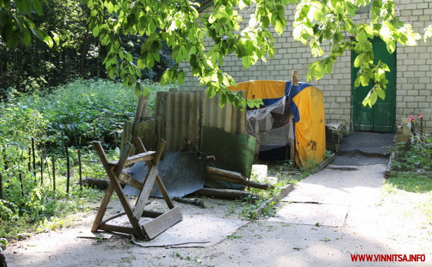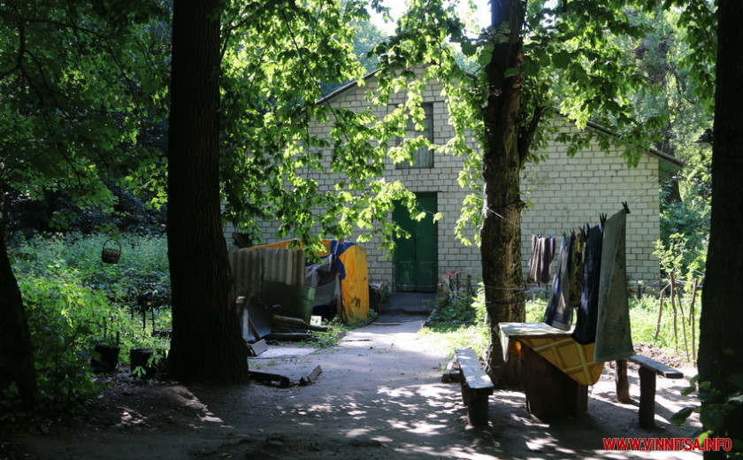 Неподалік комплексу – зачинена на замок будівля. Втім, схоже, нею або навколишньою територією хтось користується. Біля входу облаштували імпровізовану «халабуду», на мотузках між деревами висять старезні рушники, а скатертина на столі має цілком пристойний вигляд. До того ж, невідомий господар облаштував собі невеличке господарство, обгородивши окремі ділянки мотузками. Самого господаря на місці не було.