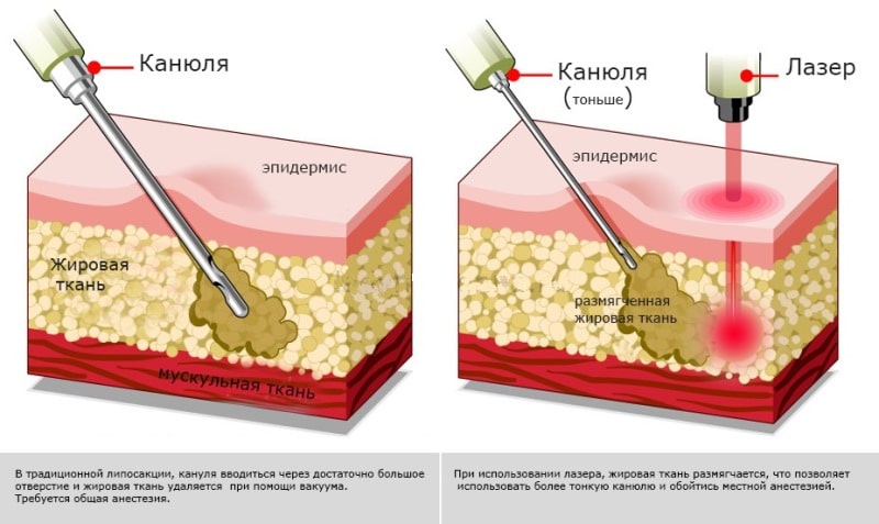 Лазерна ліпосакція – це микропрокол для просування тонкого зонду. Лазер не руйнує жирові клітини. Залежно від робочої зони і особливостей пацієнта процедура проводиться під місцевим чи загальним наркозом. Процес ліполізу нешкідливий. В даному випадку немає кровотечі, гематом і рубців. Заживають проколи через 2-3 дня. Після процедури необхідно носити коригуючу білизну.
