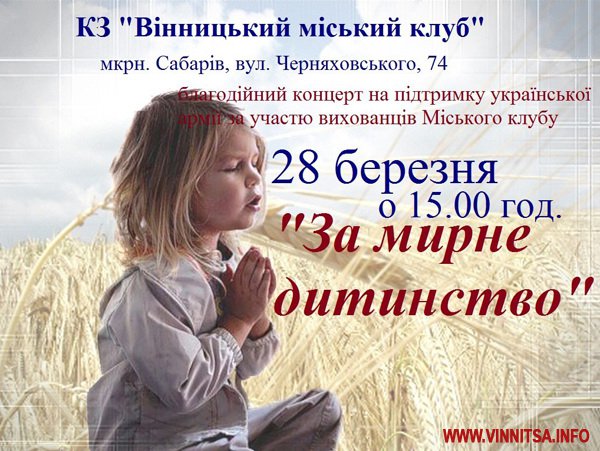 28 березня о 15 годині у КЗ Вінницькому міському клубі відбудеться благодійний концерт на підтримку української армії "За мирне дитинство".