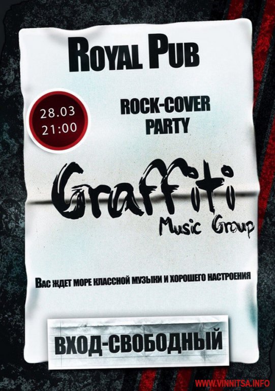 Ще один рок концерт в суботу, 28 березня вінничани зможуть відвідати безкоштовно це Graffiti Music Group. "Rock-Cover-Party, який відбудеться о 21:00 в «Роял Пабі».