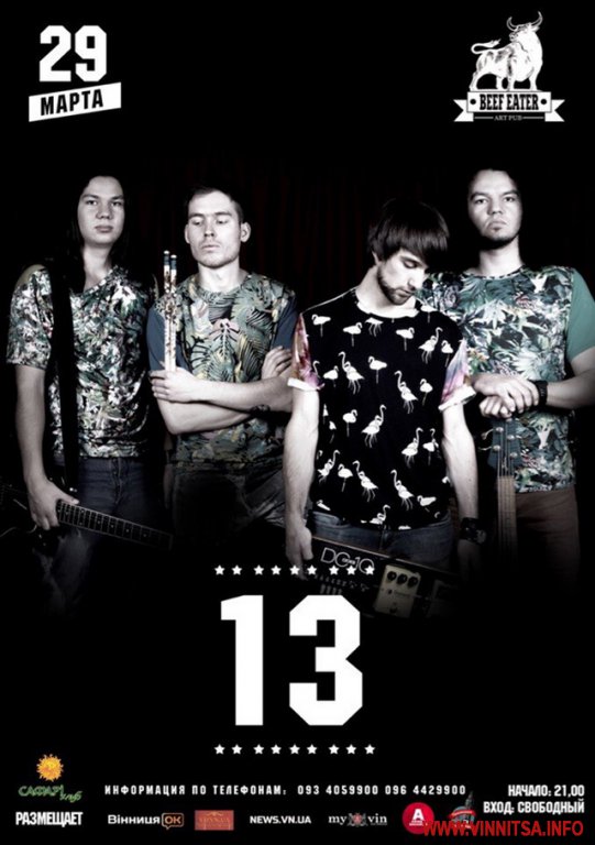 «Гурт 13» запрошує вінничан на свій концерт в неділю 29 березня, який відбудеться в Арт–пабі "BEEF-EATER" о 21:00.