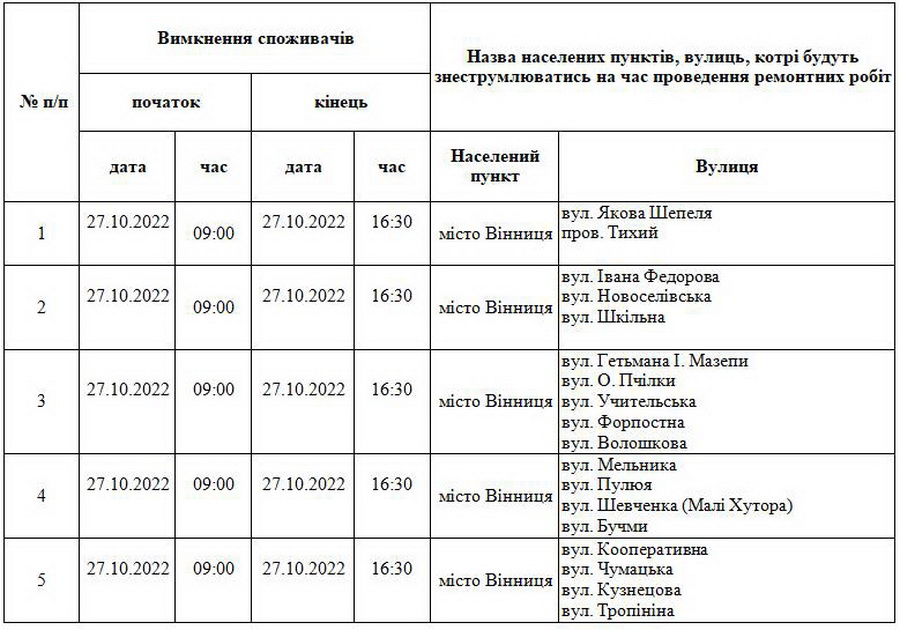Вінницькі міські електромережі опублікували графік планових перерв у електропостачанні на 27 жовтня.