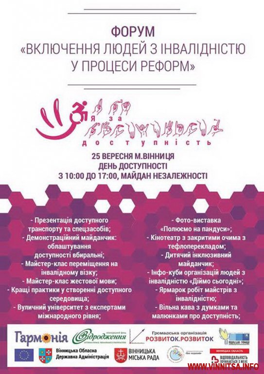 24-26 вересня у Вінниці з нагоди Дня доступності на Майдані Незалежності відбудеться форум «Включення людей з інвалідністю у процеси реформування».