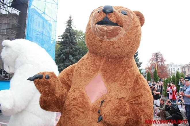 Щойно офіційна частина Дня народження закінчилася, біля сцени з’явився прапор-смайлик, велетенські ходулісти, клоуни і триметрові ведмеді.