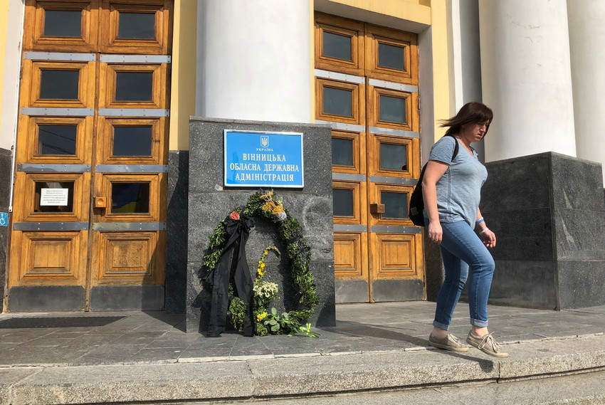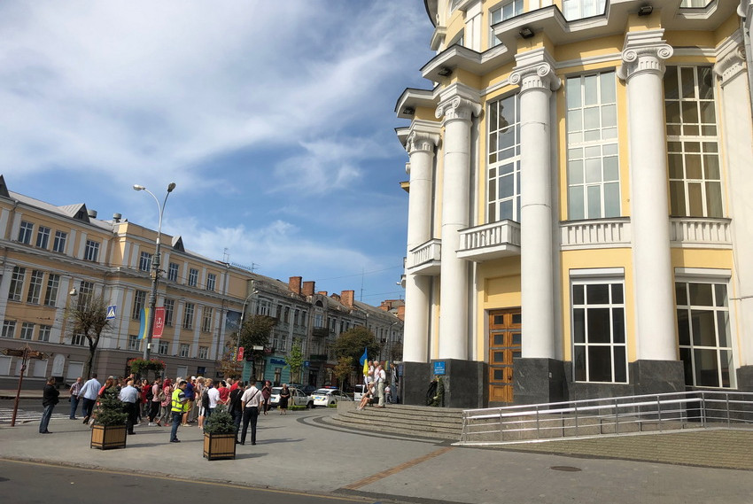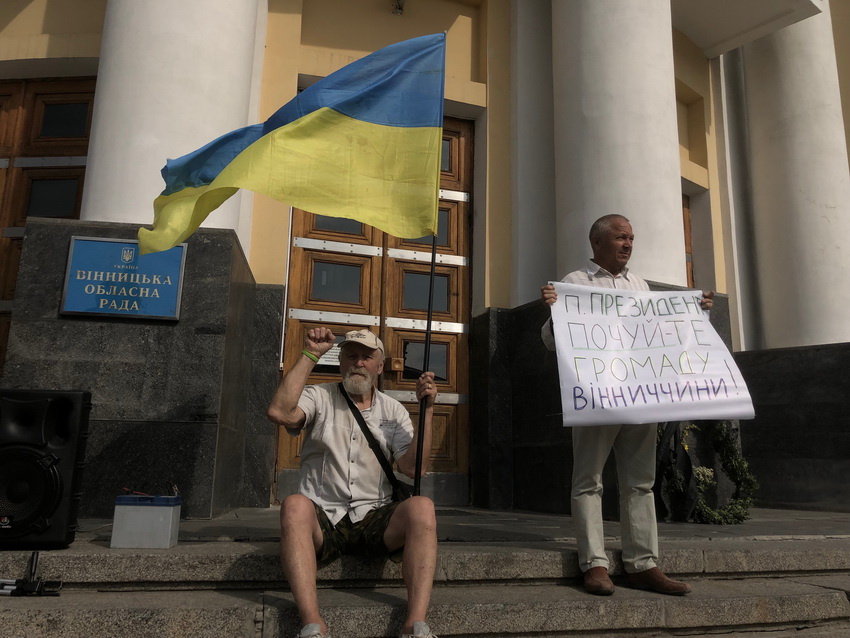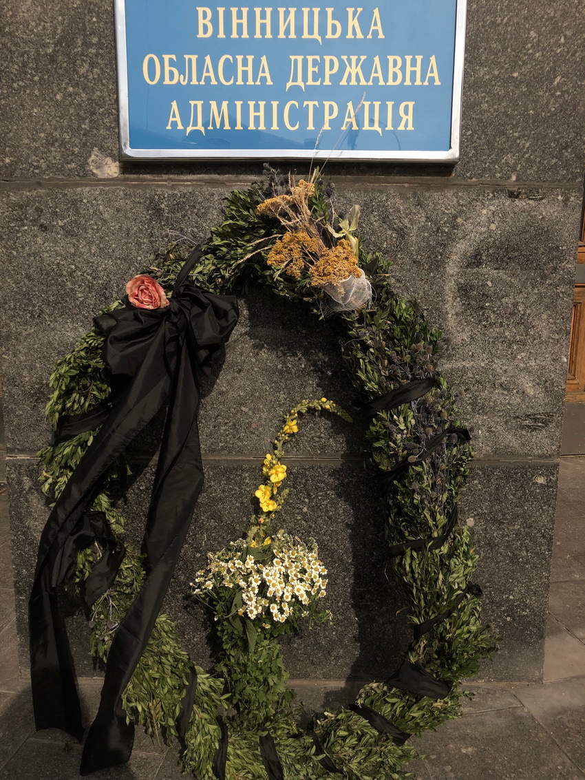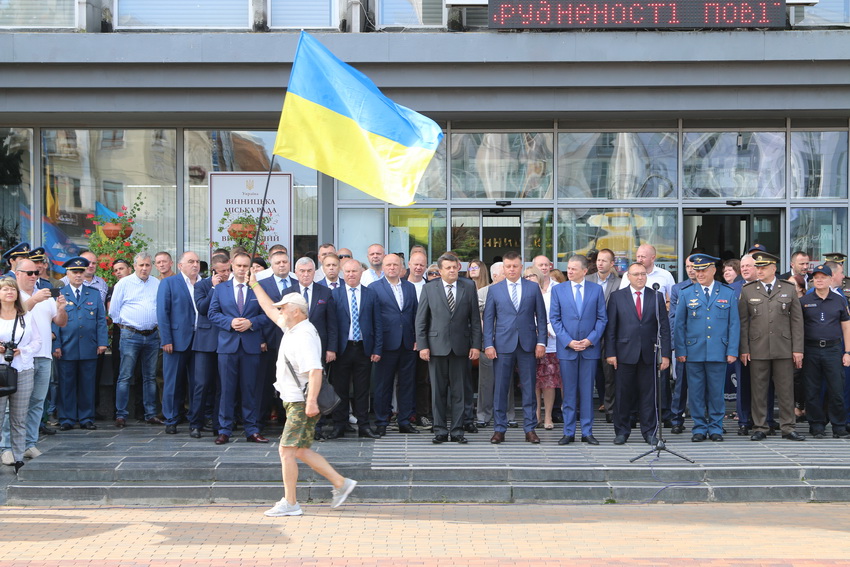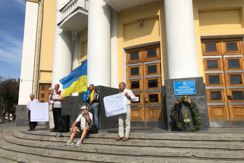 23 серпня на Соборній у Вінниці провели два заходи - святковий і протестний. Біля мерії відзначали День державного прапора, а біля будівлі облдержадміністрації близько двох десятків людей, переважно літнього віку, вийшли на мітинг, щоб сказати, кого Зеленський має розглядати кандидатами на посаду голови Вінницької ОДА. Кандидатура Владислава Скальського, якого пропонують призначити очільником області, у разі звільнення Валерія Коровія, не сподобалась окремим місцевим активістам. В знак протесту принесли траурний вінок та дві жовті троянди.