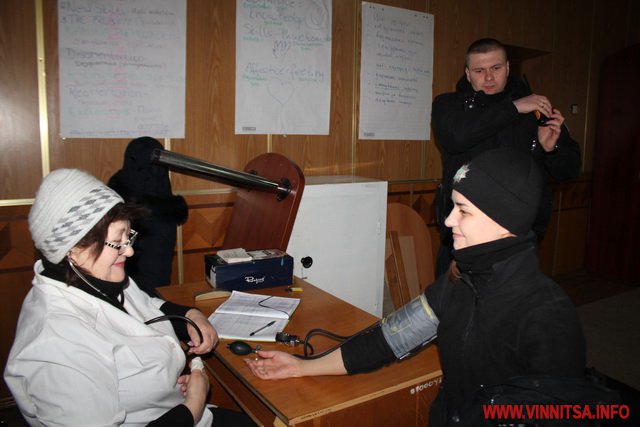 У сусідньому кабінеті лікар перевіряє стан здоров’я поліцейських. Питають, чи немає скарг, чи не підвищена температура.