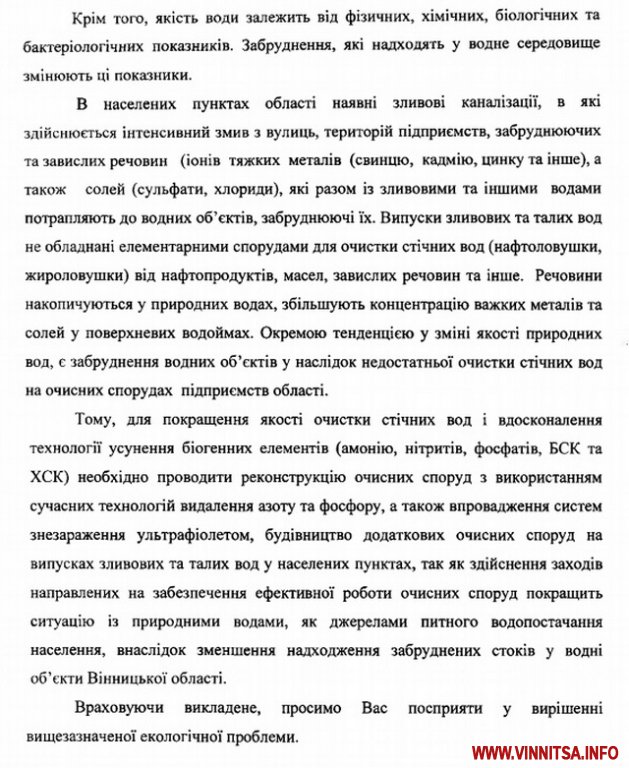 У листі депутати написали, що екологічний стан річки Південний Буг погіршується з кожним роком, що ставить під загрозу забезпечення Вінниці питною водою. Також в зверненні йдеться про необхідність очищення від мулових наносів дна Сабарівського водосховища та малих річок у Вінниці, які впадають у водосховище і необхідності очищення стічних вод, які йдуть у зливові каналізації.