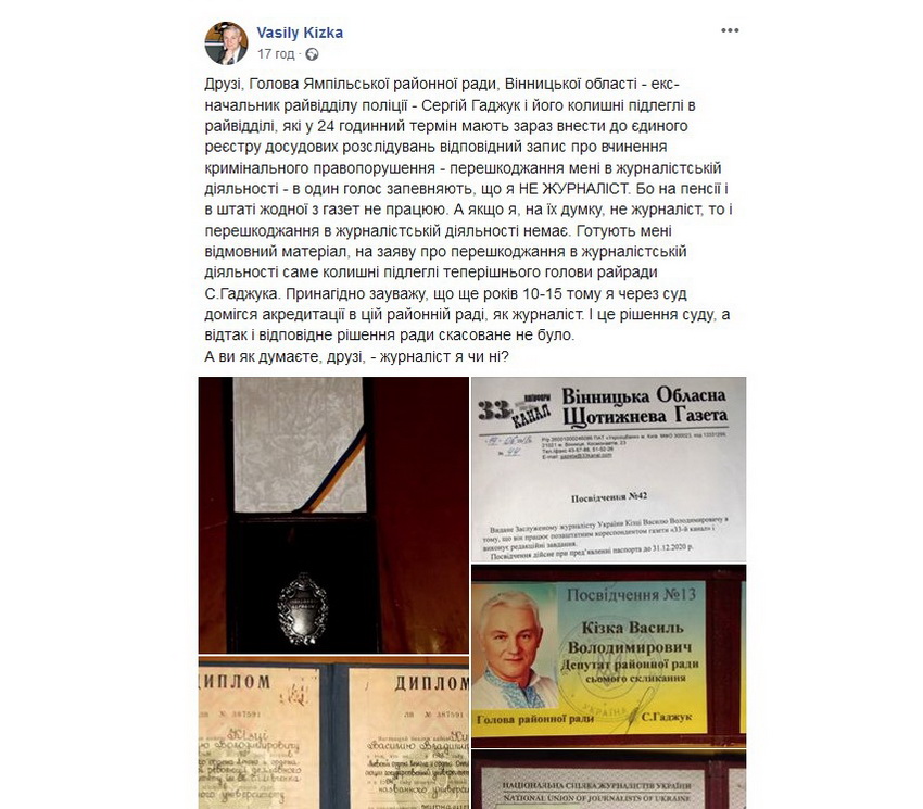 4 грудня, близько 11.00 години, із заявою до Ямпільського відділення поліції про перешкоджання законній професійній діяльності журналіста звернувся 62-річний Василь Кізка, позаштатний кореспондент обласного друкованого видання. За словами заявника, під час засідання комісії районної ради депутатка забрала в нього фотоапарат.
