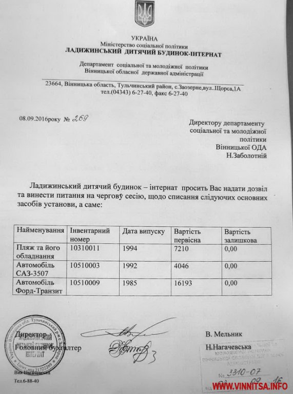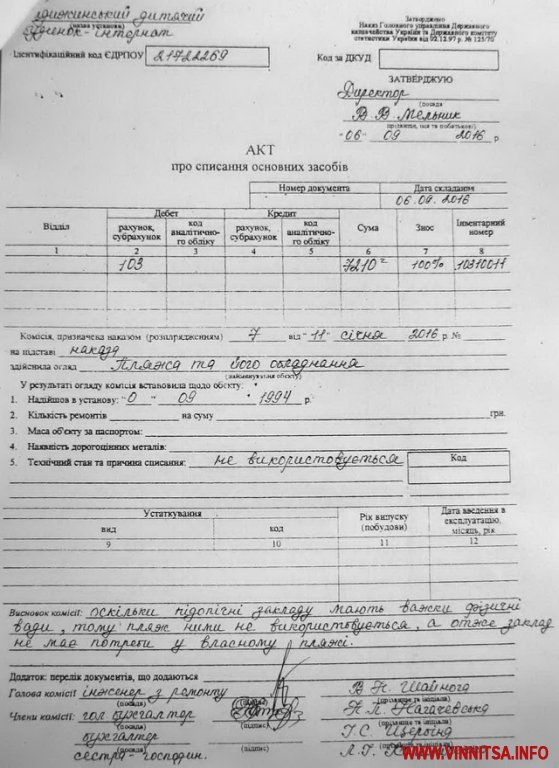 Так 8 вересня на ім’я директора департаменту соціальної та молодіжної політики облдержадміністрації Наталії Заболотної надійшов лист від директора Ладижинського дитячого будинку-інтернату Володимира Мельника про дозвіл списати пляж, який належить закладу. До заяви додано акт списання від 6 вересня, в якому зазначено, що причиною для списання є те що пляж не використовується: «оскільки підопічні закладу мають важкі фізичні вади, тому нами пляж не використовується, а отже заклад не має потреби у даному пляжі», - зазначено у висновку комісії інтернату, підписаному директором та головним бухгалтером.