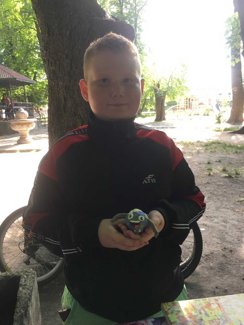 «Мій тато і інші тати воюють за нас і захищають нас, тому я вирішив їм допомагати. Я змайстрував іграшки з пластиліну, з ниток, зв’язав патріотичні браслети. Мені подобається майструвати. Я сам придумую дизайн своїх іграшок. Ліплю їх із повітряного пластиліну, це розвиває уяву і моторику рук. Я відчув, що це хобі допомагає мені у навчанні. Моя улюблена іграшка - це планета земля. На виготовлення однієї іграшки я витрачає пів години свого часу. Тому і ціні дуже символічні- велика іграшка коштує 15 гривень, а маленька – 10 гривень. Я вже зібрав біля 80 гривень і впевнений, що зможу виторгувати більше для наших воїнів», - каже Ростислав.
