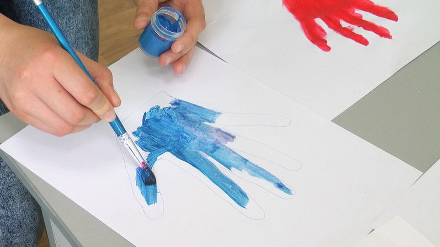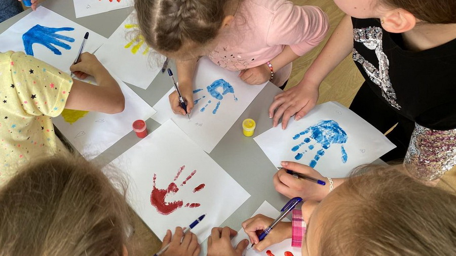Під час танцювального марафону відвідувачі вчать фрукти англійською. Кольори діти вивчають, розмальовуючи руки різними фарбами.