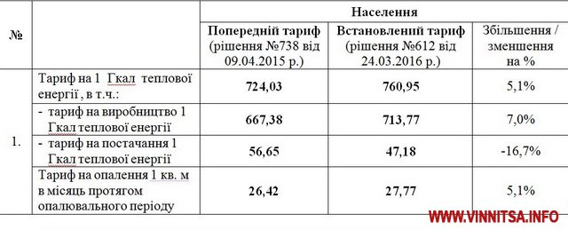 Рішення Про встановлення тарифів на теплову енергію для населення, що виробляється та постачається ТОВ «ВІНТЕА» затверджено виконкомом Вінницької міської ради від 24 березня 2016 року.
