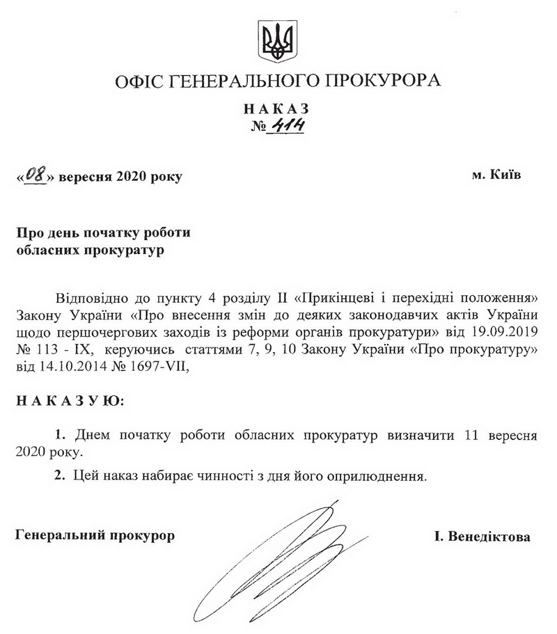 Наказом Генерального прокурора від «08» вересня 2020 року № 414 11 вересня 2020 року визначено днем початку роботи обласних прокуратур.