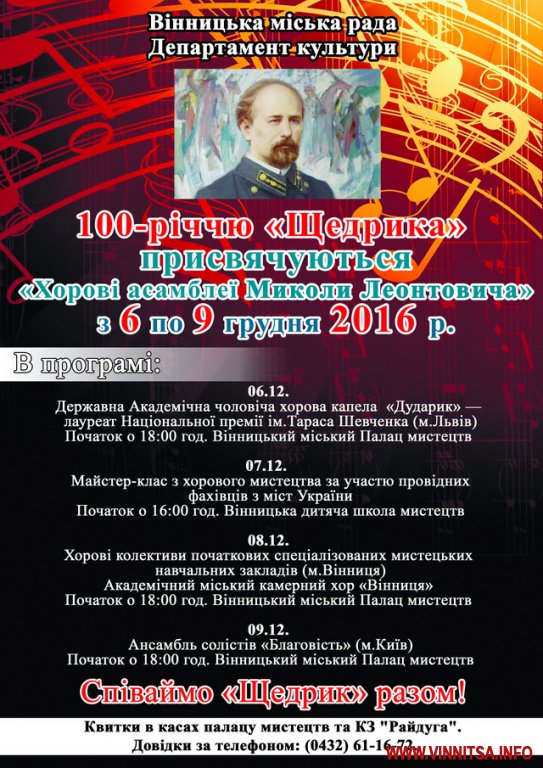 6-9 грудня у Вінниці відбудуться «Хорові aсaмблеї Миколи Леонтовичa». Це ряд зaходів, присвячених 100-річчю з дня, коли нaш земляк, відомий укрaїнський композитор Миколa Леонтович, створив музичну обробку композиції «Щедрик».