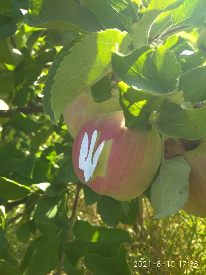 У яблуневих садах, що за 20 кілометрів від Вінниці, місцеві підприємці виростили яблука з національним символом України – Тризубом. Як розповіли господарі саду, подібне зображення на фруктах у них спеціально замовляли. Вперше, адже раніше були здебільшого «смайлики», надписи: «I love you» та логотипи фірм.