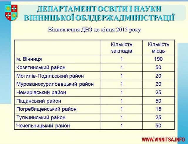 До кінця 2015 року у Вінницькій області кількість місць у дитячих садочках збільшиться на 445 місць. Найбільшу кількість місць планується створити Вінниці - 190.