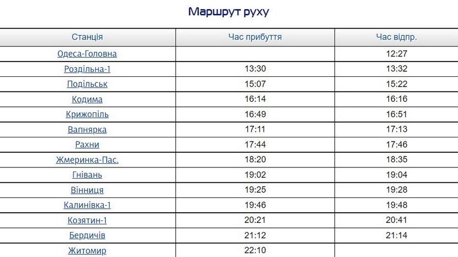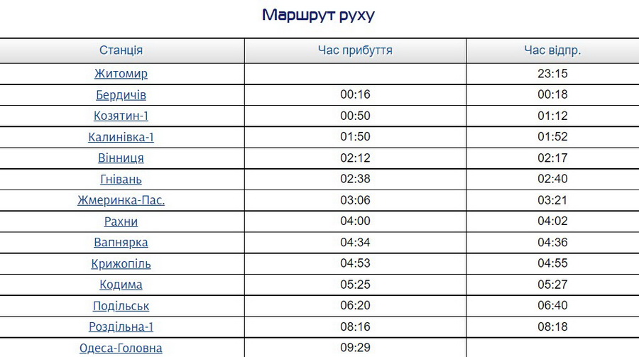 Передбачені зупинки на станціях Козятин, Рахни, Вапнярка, Подільськ та інші. Детальніший розклад: