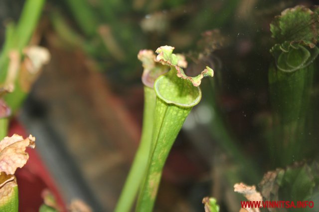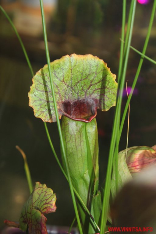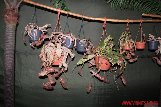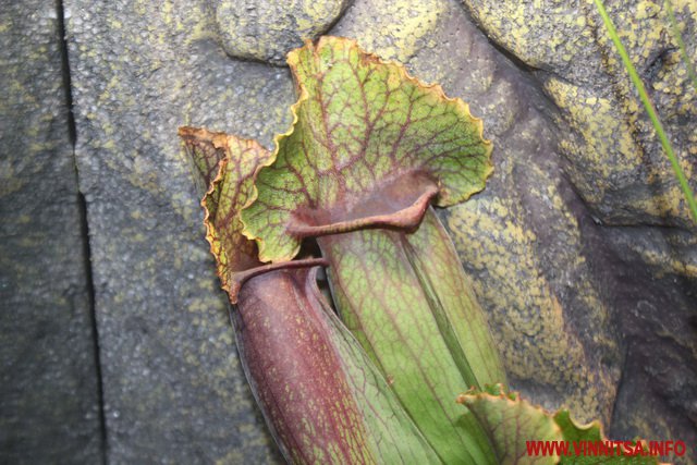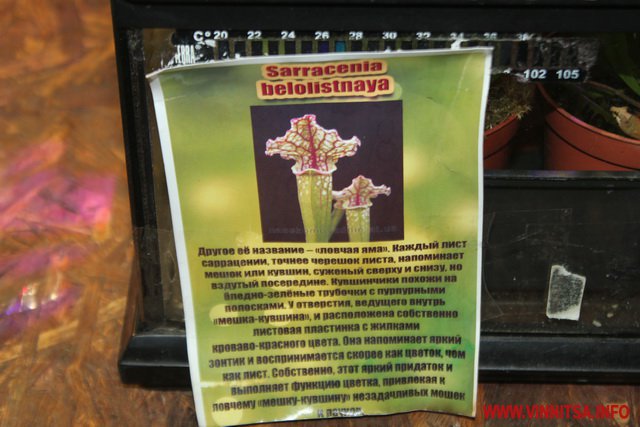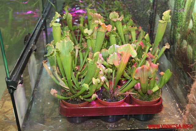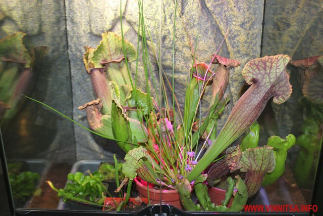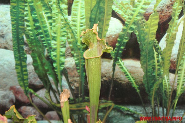 «У світі є такі рослини, які живляться живими істотами. Їх є декілька видів, перший це рослини, які активно ловлять жертву і є пасивна ловля. Тут на виставці у Вінниці представлені Сараценії це пасивна ловля, вони розставляють свої апарати і ждуть коли туди щось попаде, активна ловля це Діанеї мухоловки вони мають листя з довгими зубчиками по краях, які служать своєрідним замком і закриваються коли туди щось потрапить. Це сама швидка рослина на Планеті», - каже представник Ігор.