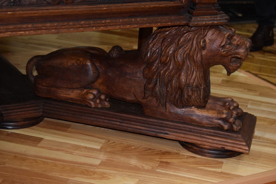«Реставрацією займався завідувач науково-дослідного відділу реставрації по дереву Олександр Закусило. Після того, як зняв старий клей та фарбу, відновив розкішну стільницю. Та з часом відшарувалася. Також довелося відновлювати різьблення людських фігур і тварин, які знаходяться на ніжках та периметру столу. Оскільки не вистачало левів, реставратор заново їх відтворив в оригінальний спосіб. А саме, склеюючи дубові дошки між собою. Так, щоб утворилася голова тварини. Та доповнив втраченими деталями», - раніше повідомляли у Вінницькій обласній раді.