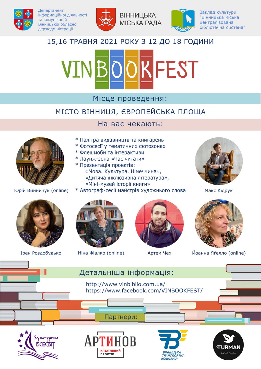 Впродовж двох днів 15-16 травня, Вінниці проходитиме уже традиційний фестиваль «VinBookFest». Минулого року через карантин захід скасували, однак цього року його проведуть у змішаному форматі – онлайн та офлайн.