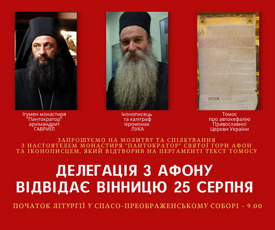 «З благословення Предстоятеля Православної Церкви України Блаженнішого Митрополита Київського і всієї України Епіфанія, на запрошення митрополита Вінницького і Барського Симеона, 25 серпня 2021 року до м. Вінниці прибуде делегація монахів зі Святої Гори Афон на чолі з ігуменом монастиря Пантократор - архімандритом Гавриїлом.