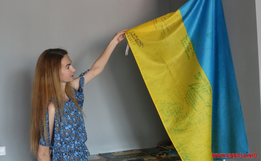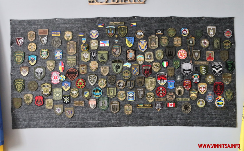 «Це шеврони наших бійців. Це афіши з заходів, які ми проводили у Києві. А це особливий прапор. Тут плями людської крові, але з воїном все добре. Все це невеличка частинка цінних речей, які ми перевезли з собою до Вінниці», - розповідає координаторка ГО «Спілка Учасників, Ветеранів, Інвалідів АТО та бойових дій» Анастасія, яка погодилась провести невеличку екскурсію для кореспондента Вінниця.info у новому приміщенні організації в Вінниці.