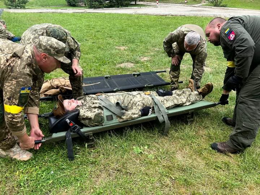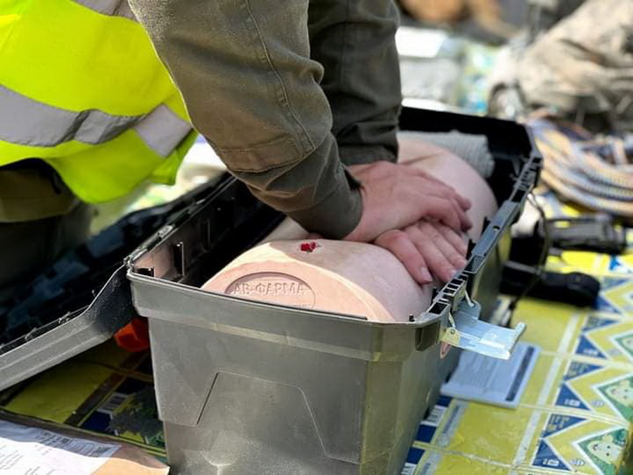 Представники добровольчих формувань навчалися тампонувати рани, надавали першу домедичну допомогу, накладали тиснучі пов'язки і турнікети та моделювали ситуацію евакуації пораненого на ношах.