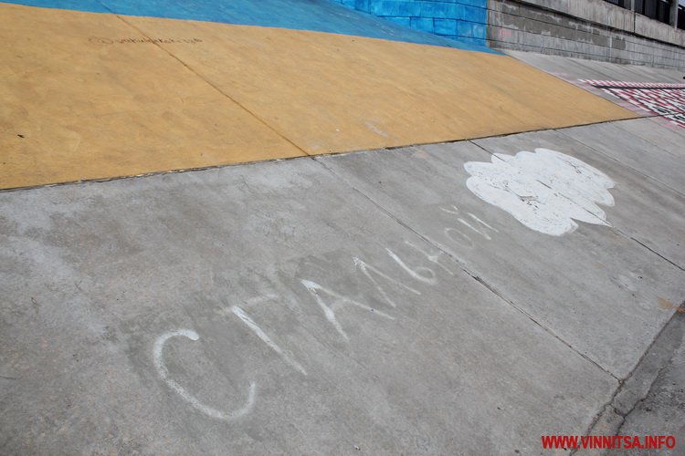 На частині бетонних жовто-блакитних плит кілька дівчат виводять фломастерами електронну адресу.