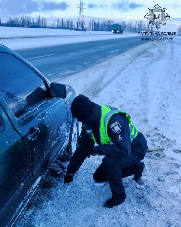 22 січня, на автошляху М-21під Вінницею, увагу патрульних поліцейських привернув Volkswagen. Автомобіль стояв між полів, а водію, як виявилося, знадобилась допомога. У машини спустило переднє праве колесо. А домкрата із собою керманич не мав.