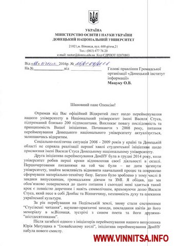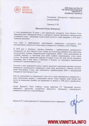 … Сьогодні в день народження поета і нашого видатного випускника важливо нагадати керівництву національного університету, який тепер знаходиться у Вінниці (до речі, малій батьківщині Стуса), про необхідність перейменування ВНЗ в національний університет ім. Василя Стуса», - йдеться в листі до керівництва ДонНУ.