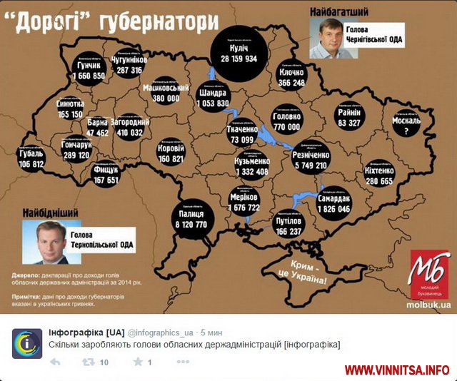 Доходи голів обласних державних адміністрацій у 2014 році оприлюднили в інфографіці.