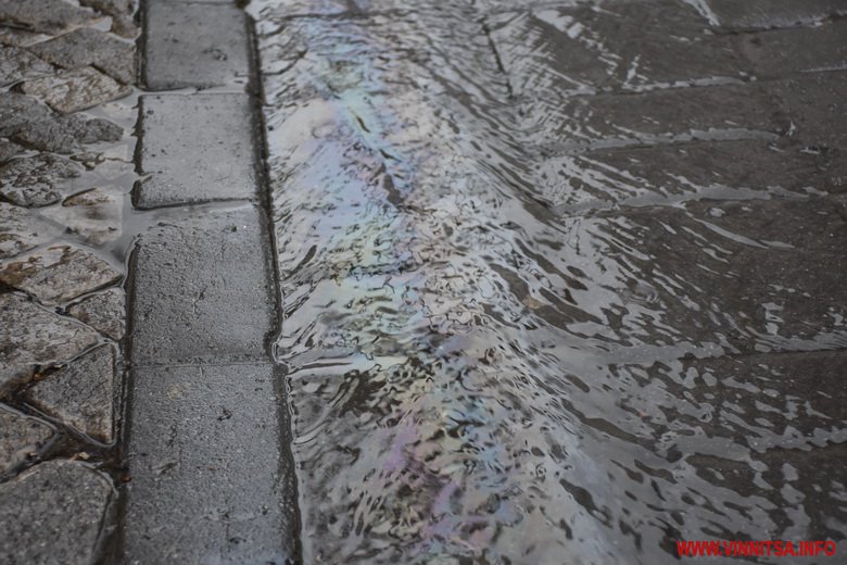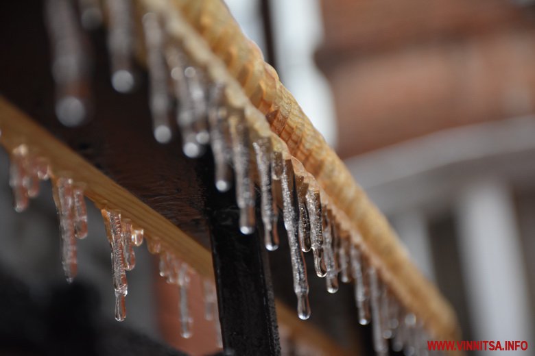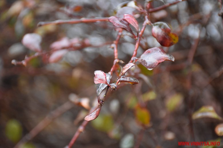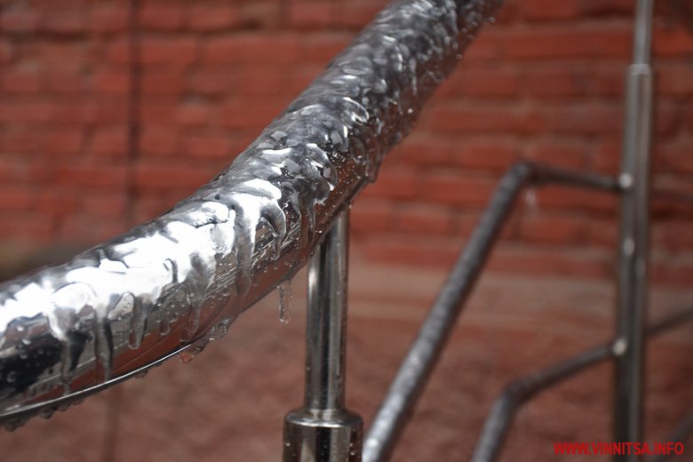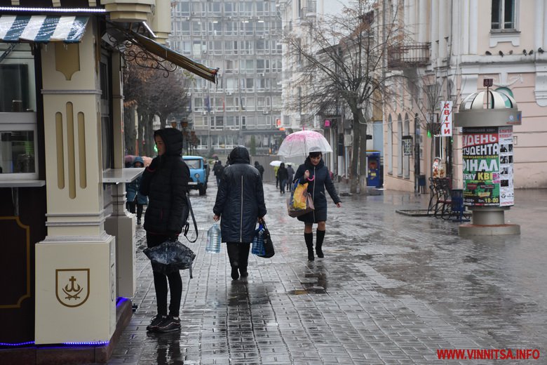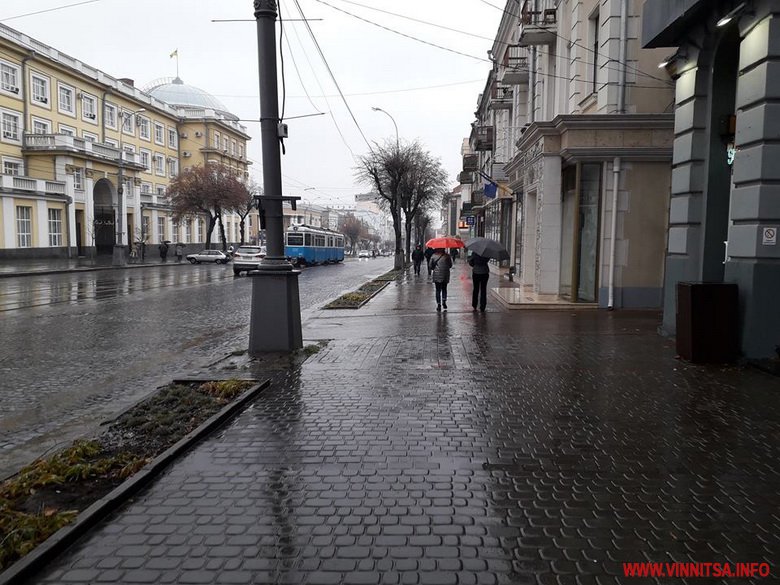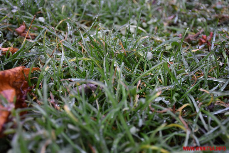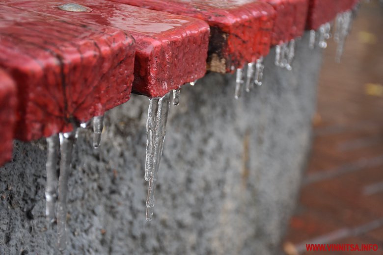 14 листопада у Вінницю прийшла негода. Ще з ночі в місті йде дощ. Опади не зупиняються ні на хвилину. Температура повітря в обласному центрі сягає мінус трьох градусів морозу. Тому краплі води, які падають з неба, одразу замерзають.