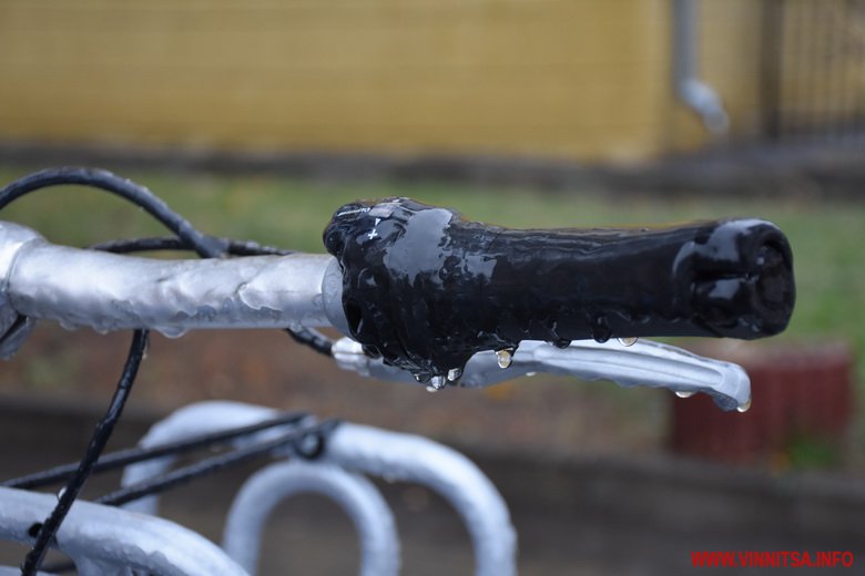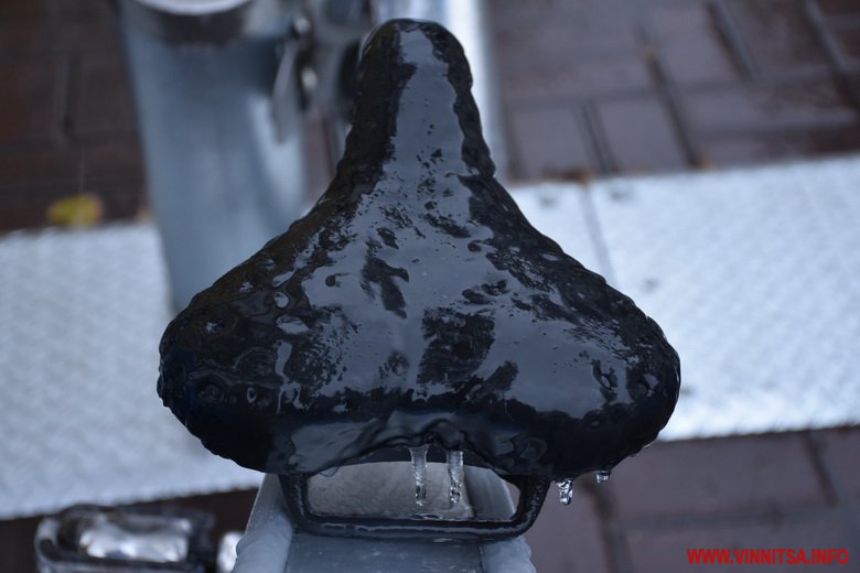 Льодом покриті автомобілі, які «ночували» не в гаражах. Лавочки, квіти, дерева… Ніби вилиті склом, велосипеди муніципального прокату.