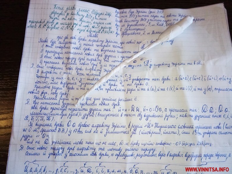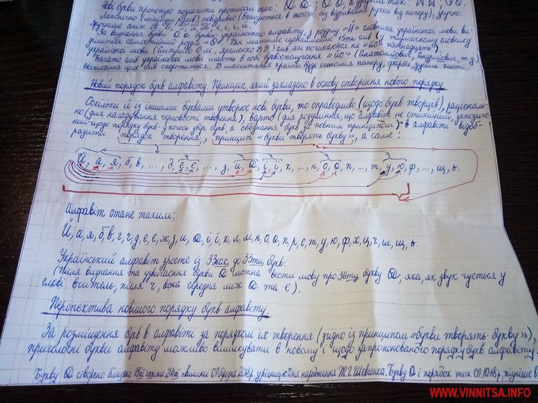 «Звернув також увагу, що в алфавіті є такі 6 голосні: а, е, и, і, о, у. Чотири з них – а, е, і, у – шляхом злучення із «й» утворюють такі букви : я (й+а), є (й+е), ї (й+і), ю (й+у). Логічно, має відбитися злучення із Й літери та літери О. Промовне разом дає уже знайоме російське Ё. Ще одне поєднання Й та И, дадуть нову літеру», - демонструє на папері свої ідеї.