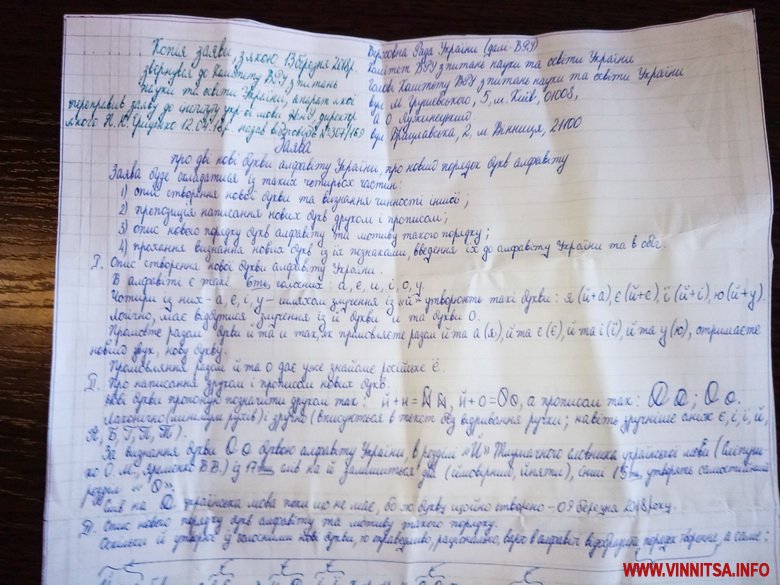 «Про дві нові літери алфавіту України, про новий порядок букв. Враховуючи зазначене, керуючись статями 10 та 40 Конституції України, прошу про здійснення заходів з такими результатами: визнання двох нових літер, визнання їх написання,введення цих літер до українського алфавіту, збільшення літер українського алфавіту із 33 до 35-ти, затвердження нового порядку літер українського алфавіту…», - йдеться у звернені.