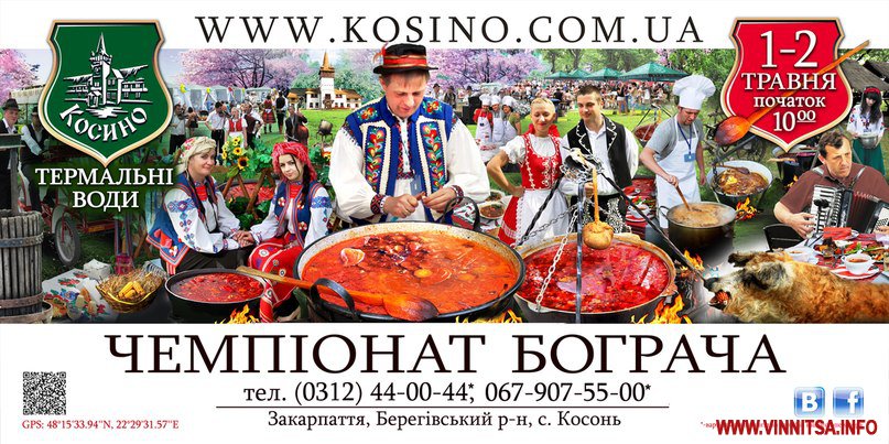 1-2 травня 2014 на Закарпатті вдруге пройде «Чемпіонат Бограча». Усіх бажаючих запрошують пригоститися смачним бограчем, який готуватимуть професіонали даної справи. У чемпіонаті будуть приймати участь 10 команд, і кожна з них має приготувати не менше 150 літрів бограчу. Отже за 2 дні чемпіонату буде зварено понад 3000 літрів бограча – вистачить для всіх гостей свята. Готувати бограч будуть як чоловіки, так і жінки – то хто ж з них справніший?