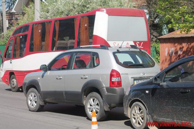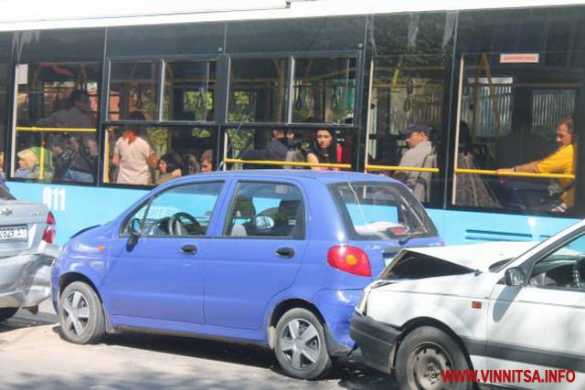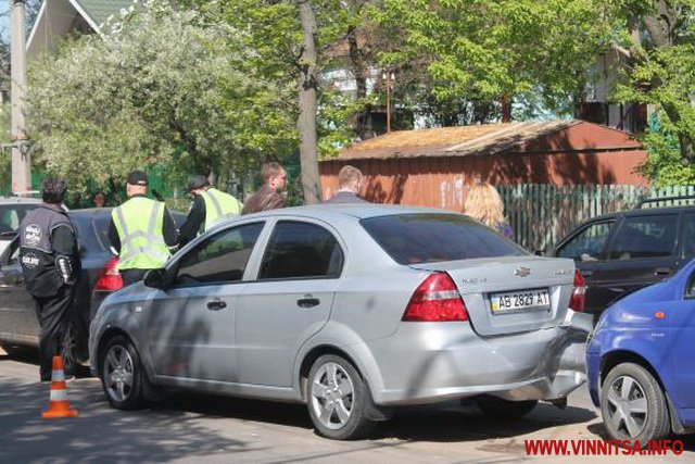 «На вулиці Брацлавська, біля будинку, 26 водій автомобіля «Хюндай» призупинився перед поворотом ліворуч. За ним їхали два автомобіля марки «Шевроле», потім «Део», і в кінці «Фольксваген Пассат». Водій «Фольксвагена» не дотримався безпечної дистанції, в’їхав в «Део», «Део» в’їхала в «Шевроле Авео», авто в’їхало в «Шевроле» попереду, і «Шевроле» - в «Хюндай»… Тобто, всі машини між собою стукнулись, вже по інерції.
