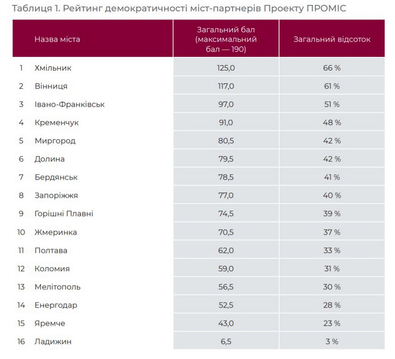Опубліковано дослідження «Індекс демократичності міст – 2020: Звіт про оцінювання стану впровадження інструментів місцевої демократії в органах місцевого самоврядування міст-партнерів Проекту ПРОМІС». Лідерами у процедурах якості місцевої демократії стали: Хмільник — 66 %, Вінниця — 61 %, Івано-Франківськ — 51 %. Найгірша ситуація з регулюванням місцевої демократії склалася в таких містах, як: Ладижин — 3 %, Яремче — 23 %, Енергодар — 28 %