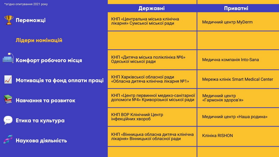 За інформацію Вінницької ОДА, у номінації «Етика та культура» у державному секторі перше місце посів Клінічний центр інфекційних хвороб. А у номінації «Наукова діяльність» у державному секторі перемогу здобула КНП «Вінницька обласна дитяча клінічна лікарня Вінницької обласної Ради».