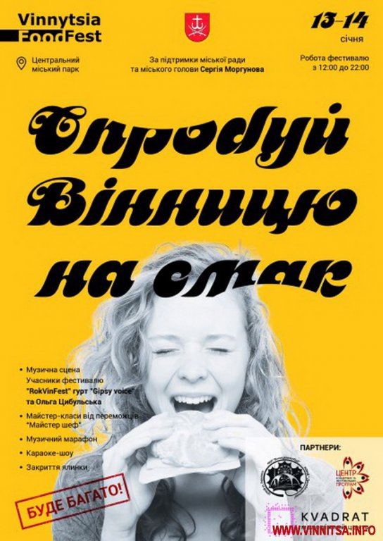 13 і 14 січня у Вінниці відбудеться дводенний фестиваль «Food weekend». На старий Новий рік біля головної ялинки міста розгорнуть ярмарок із фаст-фудом, делікатесами та шашликами. Готуватимуть для відвідувачів ресторани з Києва, Тернополя, Яремчі, Львову та Одеси.