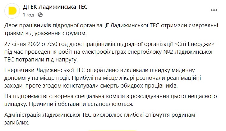 Вранці 27 січня двоє працівників підрядної організації «Сіті Енерджи» загинули від ураження струмом. Вони проводили роботи на електрофільтрах енергоблоку №2 Ладижинської ТЕС.